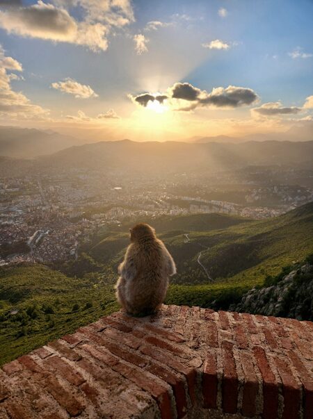 On the heights of Fort Gouraya, a Barbary macaque watches over the city of Bejaïa as the sun sets.