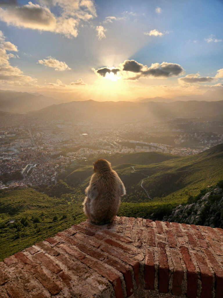 On the heights of Fort Gouraya, a Barbary macaque watches over the city of Bejaïa as the sun sets.
